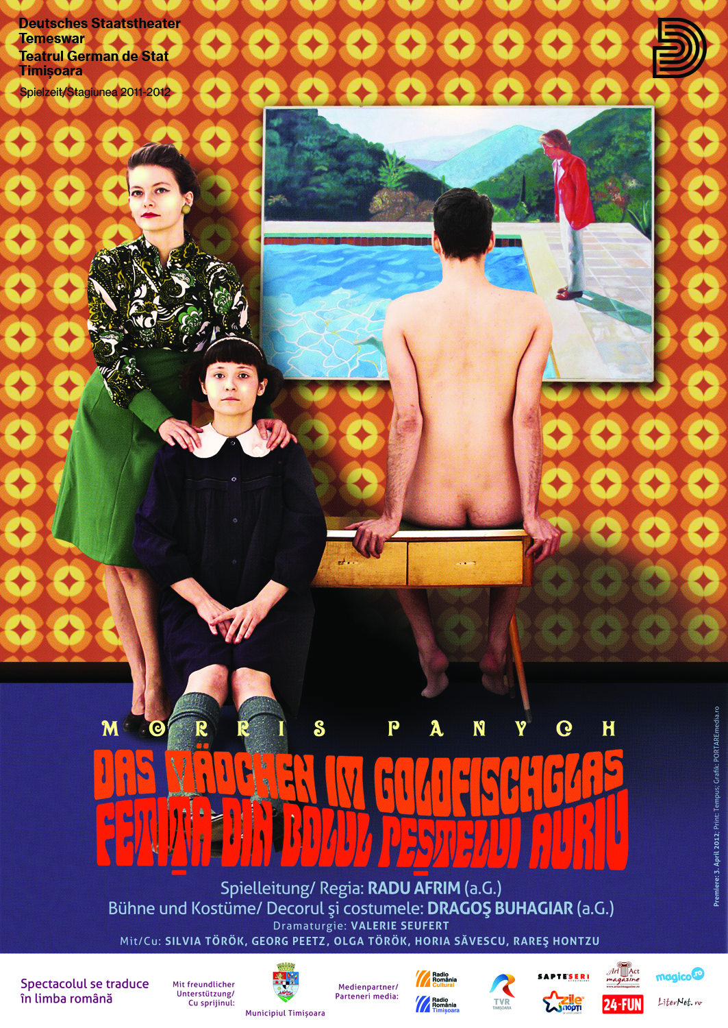 „Văzând decorul rupt din soarele saharian şi adus în scenă de Dragoş Buhagiar îţi poate trece prin cap că de data asta Afrim a regizat un spectacol vesel. Şi apoi pseudo-finalul care m-a făcut să exclam că happy ending-urile la Radu şterg tot dramatismul dinainte ca un burete pe tabla unsă de cretă, ceva nemaiîntâlnit în nimic din ce-a mai montat el (poate un pic, dar doar un pic, la Avalanşa). Cât m-am înşelat! Fetiţa din bolul peştelui auriu, cel mai recent spectacol afrimiam, de la Teatrul German de Stat din Timişoara, nu e nicidecum aşa – echilibrat până la finalul-final, când m-a făcut să plâng hohotit şi am vrut s-o zbughesc din sală direct pe scenă şi să iau în braţe fetiţa care a înotat prin anii copilăriei ca peştele Ahmal. În cerc. [...] Personajele astea cinci aduse laolaltă de dramaturgul canadian Morris Panych şi umplute cu viaţă de Afrim (aşa scăpărată, plină de goluri şi sentimente gândite, nicidecum simţite) par rupte de orice realitate pe care ar trebui să o trăiască în afara casei lor de la malul mării, dar sunt atât de bine ancorate în propriile vieţi, ca într-un neţ de pescari, încât ajungi să crezi că orice posibilă schimbare le va dezechilibra şi distruge. Iluzie.”